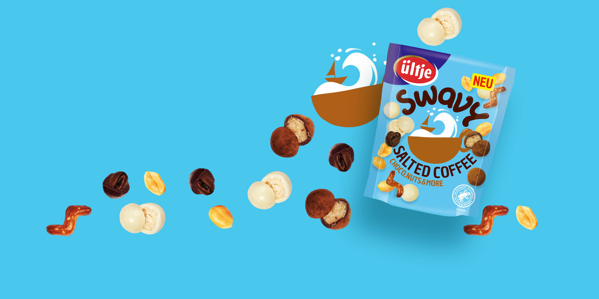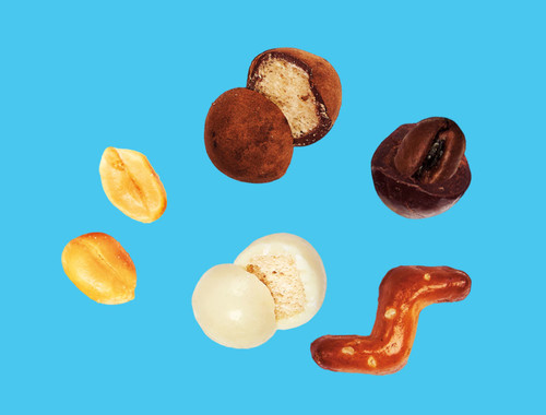 26 % ARAŠIDOVA JEDRA, 18 % temna čokolada (sladkor, kakavova masa, kakavovo maslo, naravna aroma vanilije, emulgator (lecitini (SOJA))), 18 % bela čokolada (sladkor, kakavovo maslo, POLNOMASTNO MLEKO V PRAHU, sirotkin izdelek (MLEKO), naravna aroma vanilije, emulgator (lecitini (SOJA))), 14 % mlečna čokolada (sladkor, POLNOMASTNO MLEKO V PRAHU, kakavova masa, kakavovo maslo, sirotkin izdelek (MLEKO), naravna aroma vanilije, emulgator (lecitini (SOJA))), PŠENIČNA MOKA, riževa moka, 2,0 % kavna zrna, sončnično olje, sladkor, jedilna sol, PŠENIČNA SLADNA MOKA, nemastni kakav v prahu, dekstroza, glukozni sirup, naravna aroma, sredstva za glaziranje (arabski gumi, šelak), dekstrin, kvas, regulator kislosti (natrijev hidroksid).